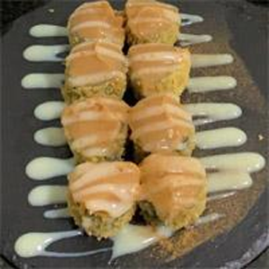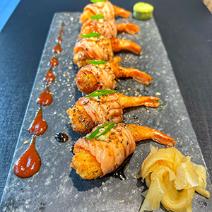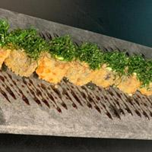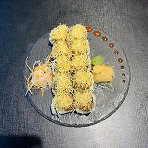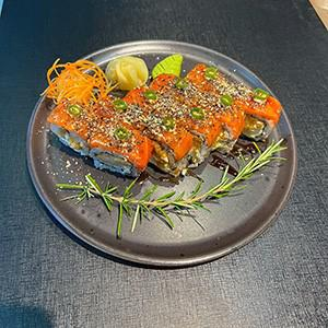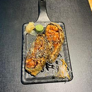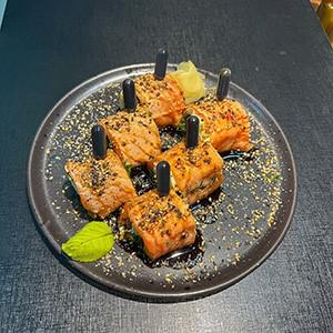Arroz envolto por salmão maçaricado e recheio de cream cheese, camarão empanado, finalizado com tare e gergelim.