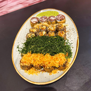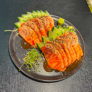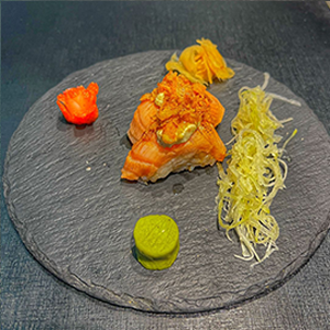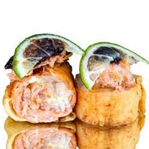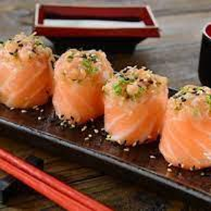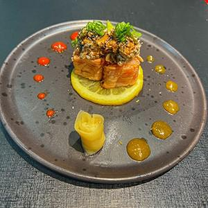 Arroz envolto por salmão maçaricado e recheio de cream cheese, salmão empanado, fina fatia de limão, maionese, pimenta, tarê e gergelim.