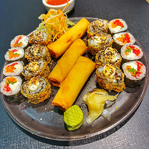 10 uramakis skin lemon, 8 croquetes de salmão, 4 hot crispy de couve, 4 hot crispy de batata doce, 4 niguiris skin lemon e 4 harumakis de salmão.