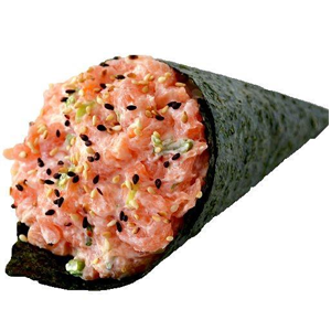 Arroz envolto por salmão e recheio de salmão picado com cebolinha.
