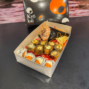 2 Gunkan Filadélfia, 2 Gunkan Amêndoas, 2 Gunkan Crispy Couve, 2 Gunkan Gold Brie, 2 Gunkan Ebi Furai, 2 Gunkan Ovas Black, 2 Niguiri Atum, 2 Niguiri Orange Brie, 2 Niguiri Salmão Trufado.