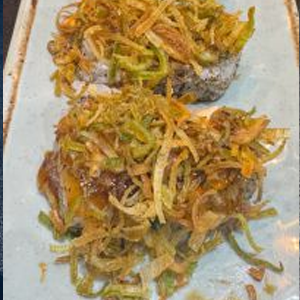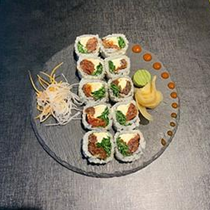 Arroz envolto por salmão maçaricado e recheio de cream cheese, geleia de figo, tarê e crispy de cebola.