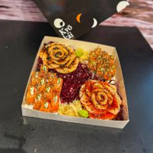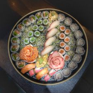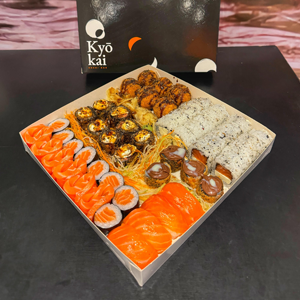12 Sashimis de Salmão, 8 Hot Filadélfia, 8 Hossomakis de salmão, 10 Uramakis Kanidelfia, 10 Uramakis Filadélfia, 4 Niguiris de salmão, 6 Croquete de Salmão e 4 Hot Nutella.