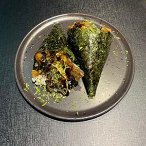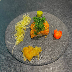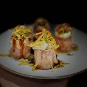 Arroz envolto por salmão maçaricado e recheio de cream cheese, finalizado com geleia de limão siciliano e crispy de alho poró.