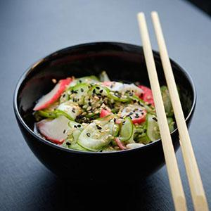 Arroz, alga, pele de salmão grelhada, finalizado com tarê e raspas de limão.