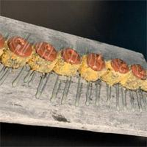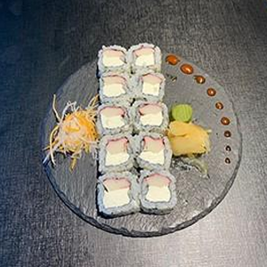 Arroz envolto por salmão maçaricado finalizado com cream cheese, queijo brie, geleia de pimenta e crispy de batata doce.