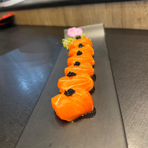 Arroz envolto por salmão maçaricado com recheio de ovas black.