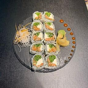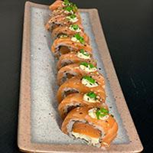 Arroz envolto por salmão e recheio de cream cheese, finalizado com tarê e gergelim.