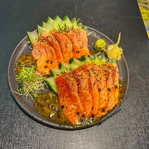 Cubos de salmão com delicioso e exclusivo molho de ostra com tempero do chef.